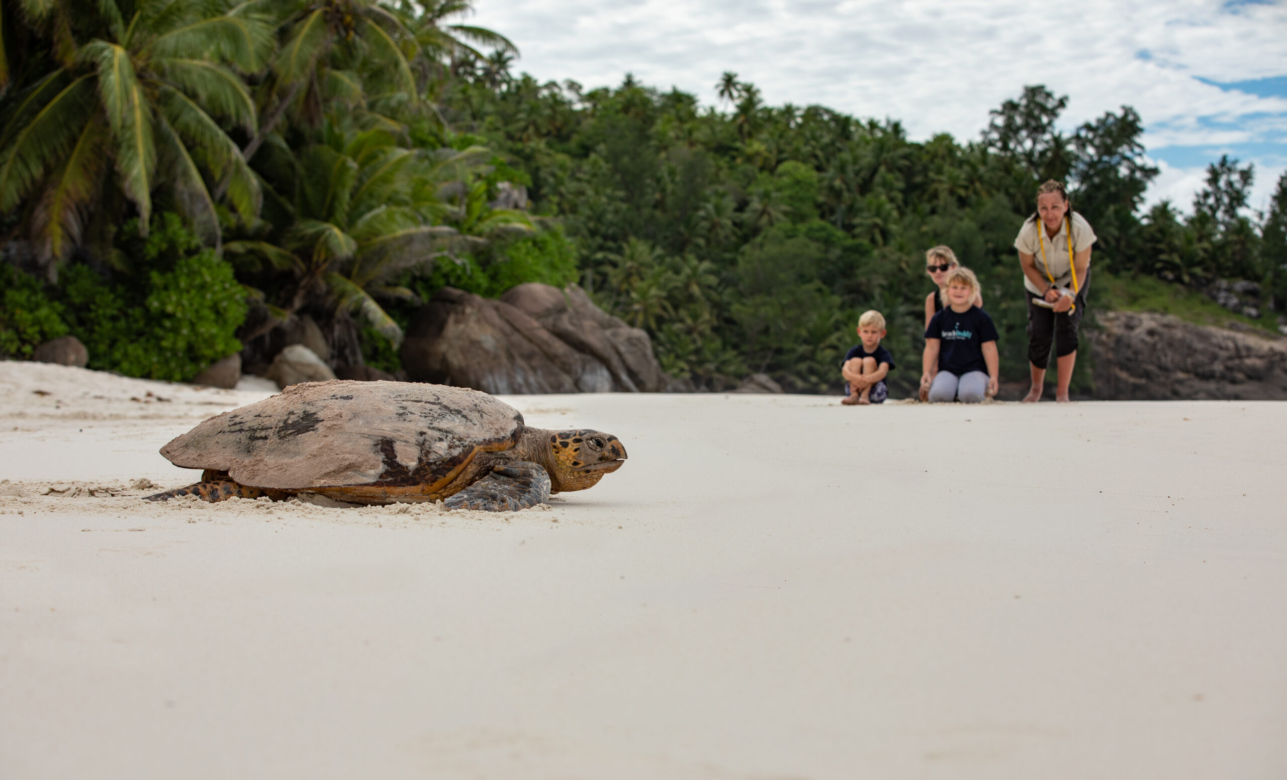 Fly til Mahe ca. 12. timer og herfra 20 min. helikopter til North Island som kan nås med helikopter eller båd.