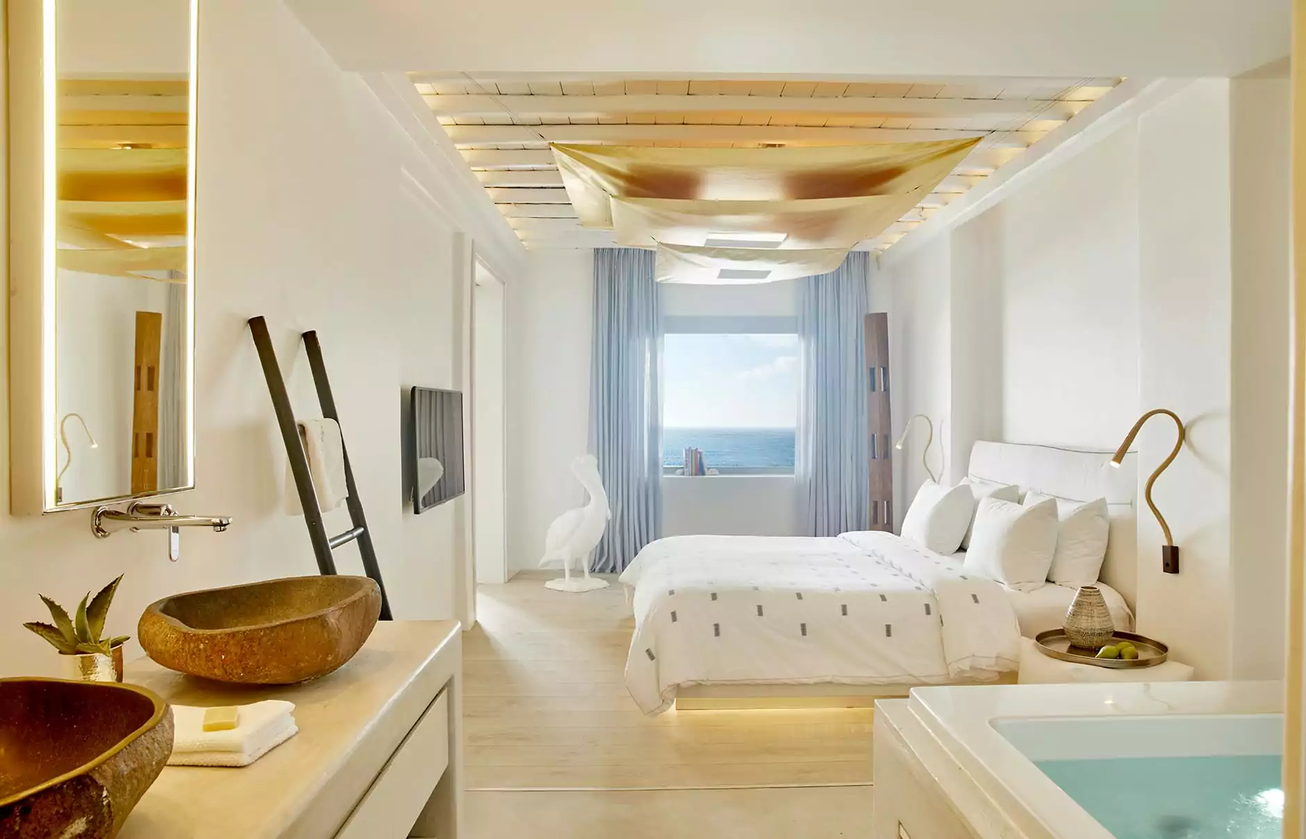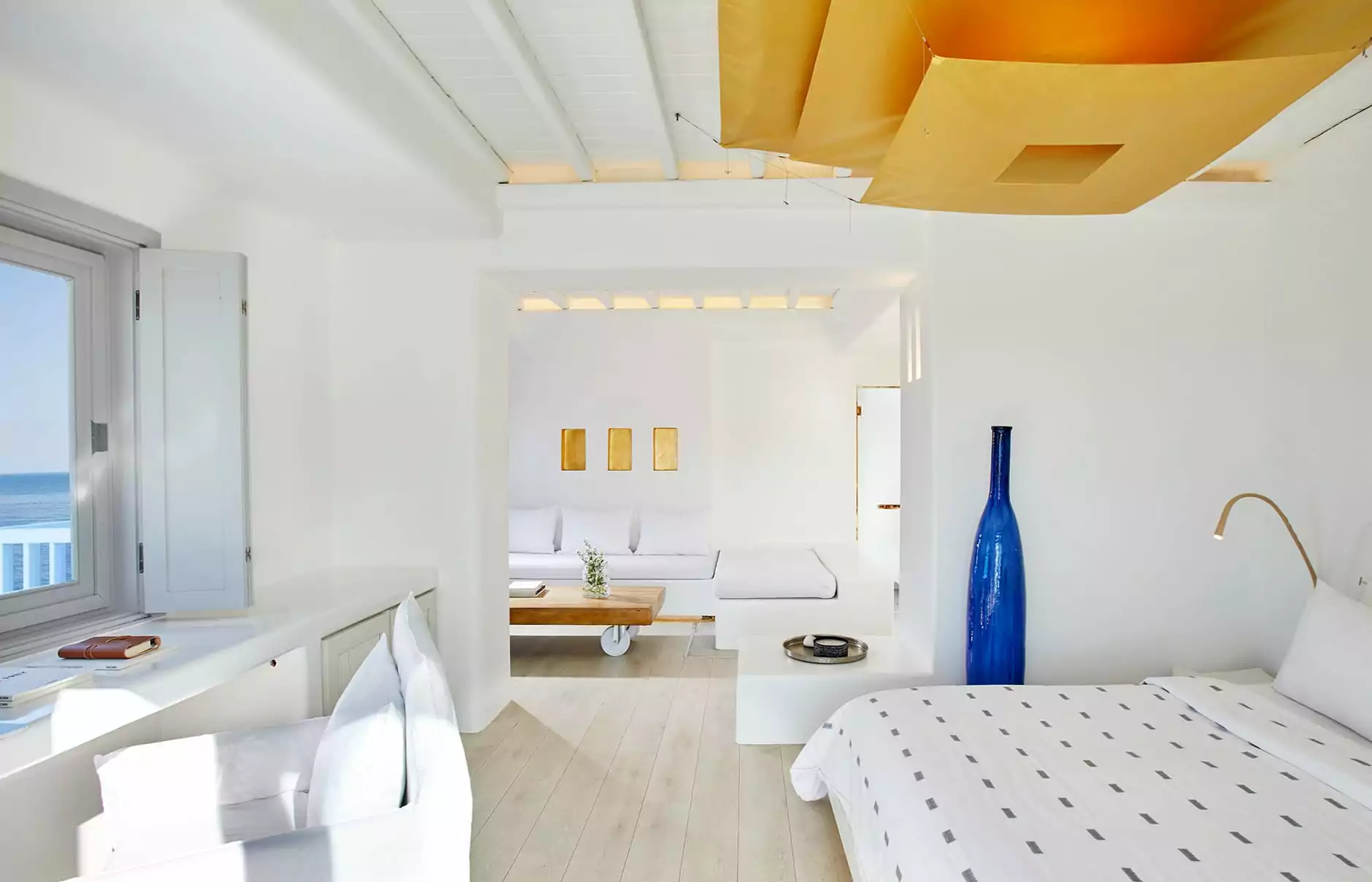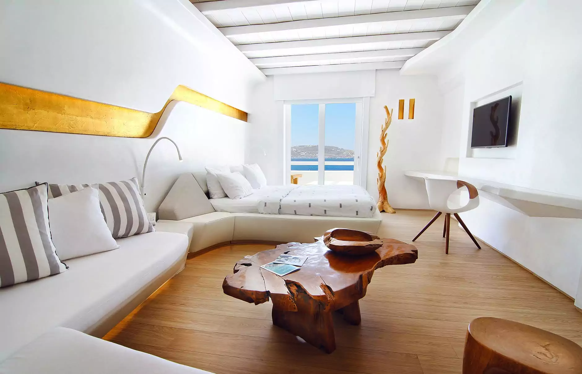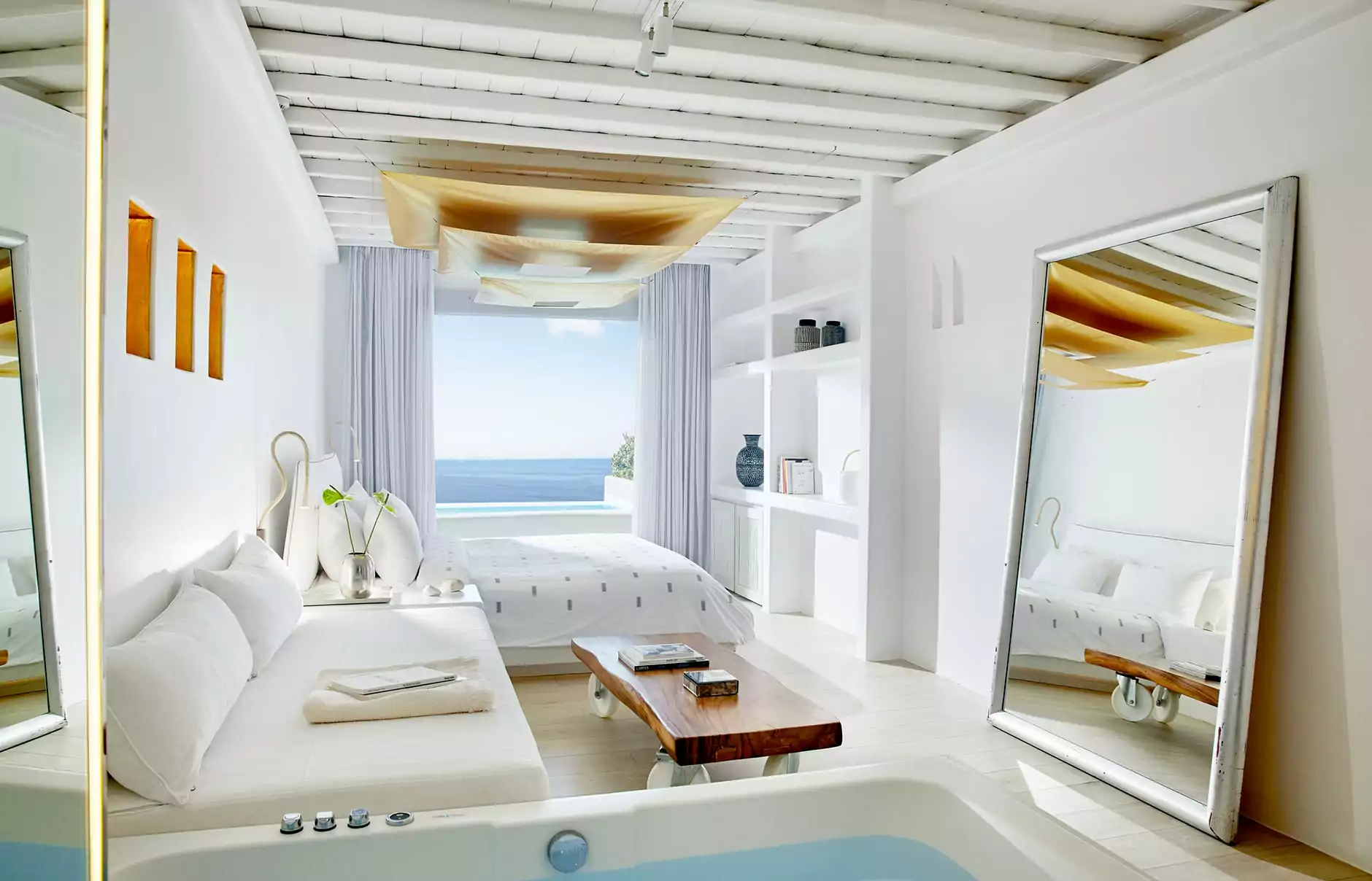 Alle værelser og suiter er individuelt indrettede og designet. Svært at vælge, det ene fra det andet. Værelserne er moderne, med minimalistisk udseende, afbalanceret af Kykladernes traditionelle æstetik. Og imod Mykonos i forvejen skønhed og bløde linjer – med de traditionelle farver (blå, rose, fuchsia) satte arkitekten skinnende marmorgulve, designermøbler og store senge, elegante rummelige badeværelser, store balkoner og private pools i en del af værelserne. Der er over 14 forskellige værelsestyper.