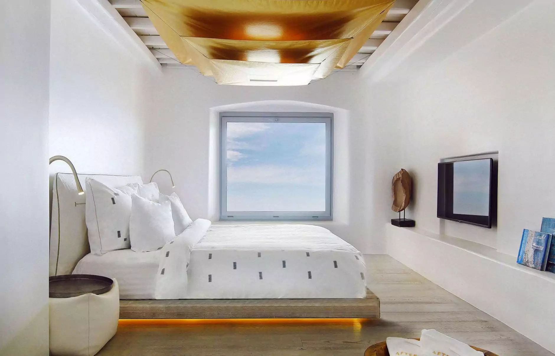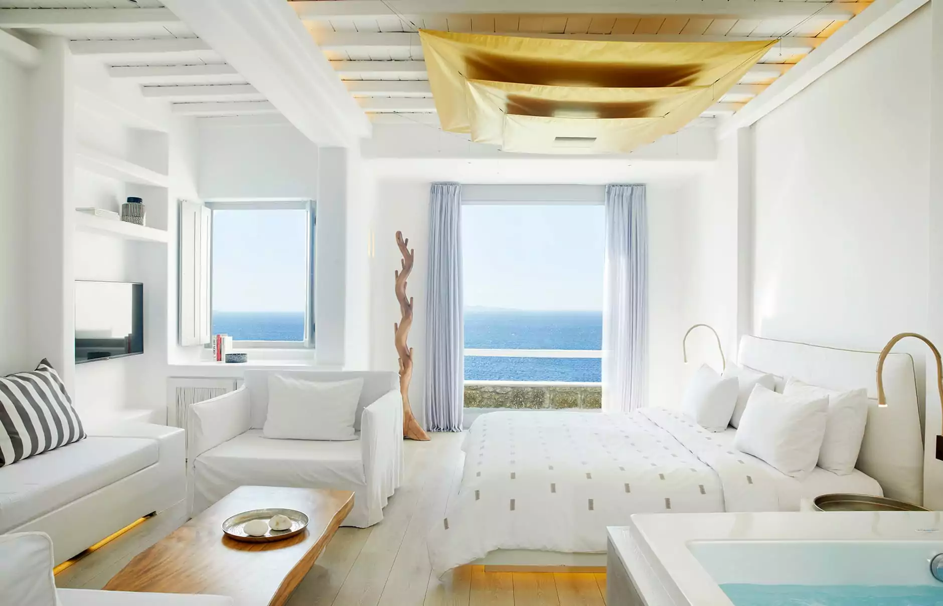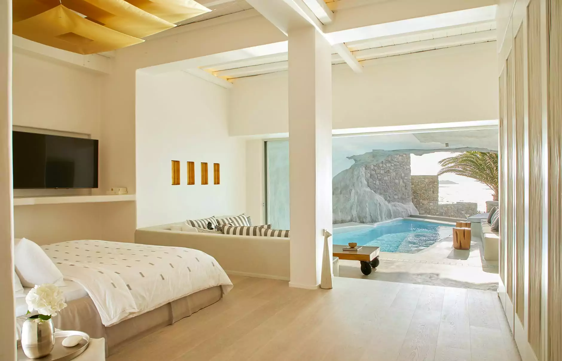 Alle værelser og suiter er individuelt indrettede og designet. Svært at vælge, det ene fra det andet. Værelserne er moderne, med minimalistisk udseende, afbalanceret af Kykladernes traditionelle æstetik. Og imod Mykonos i forvejen skønhed og bløde linjer – med de traditionelle farver (blå, rose, fuchsia) satte arkitekten skinnende marmorgulve, designermøbler og store senge, elegante rummelige badeværelser, store balkoner og private pools i en del af værelserne. Der er over 14 forskellige værelsestyper.