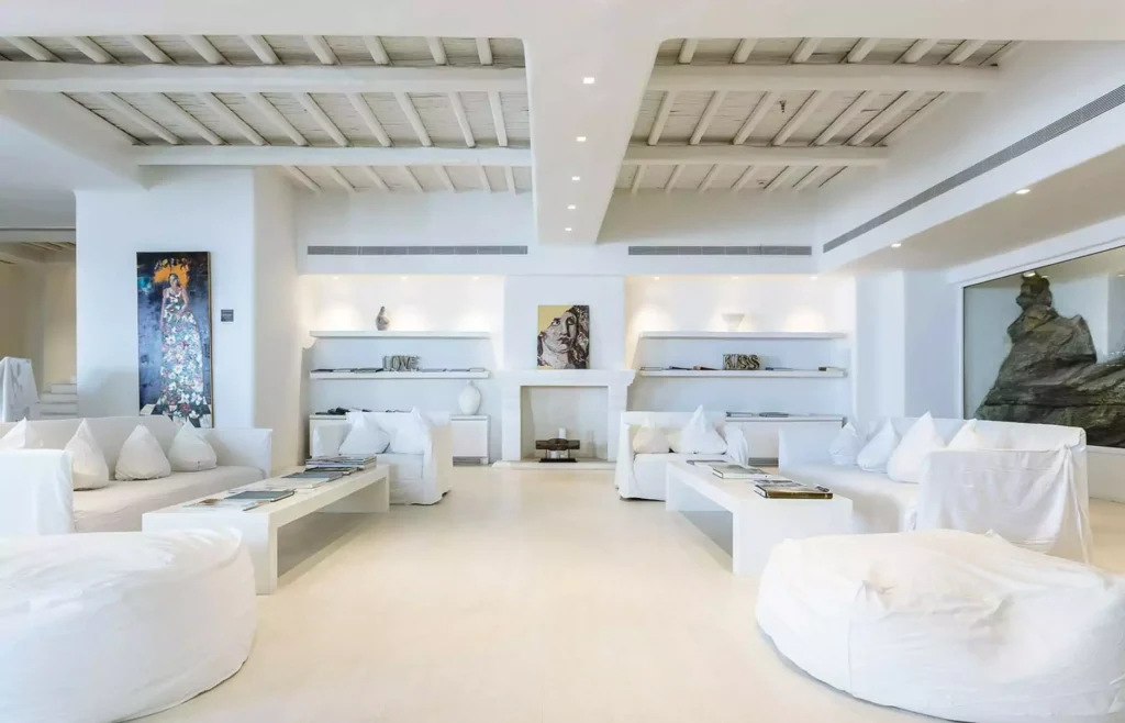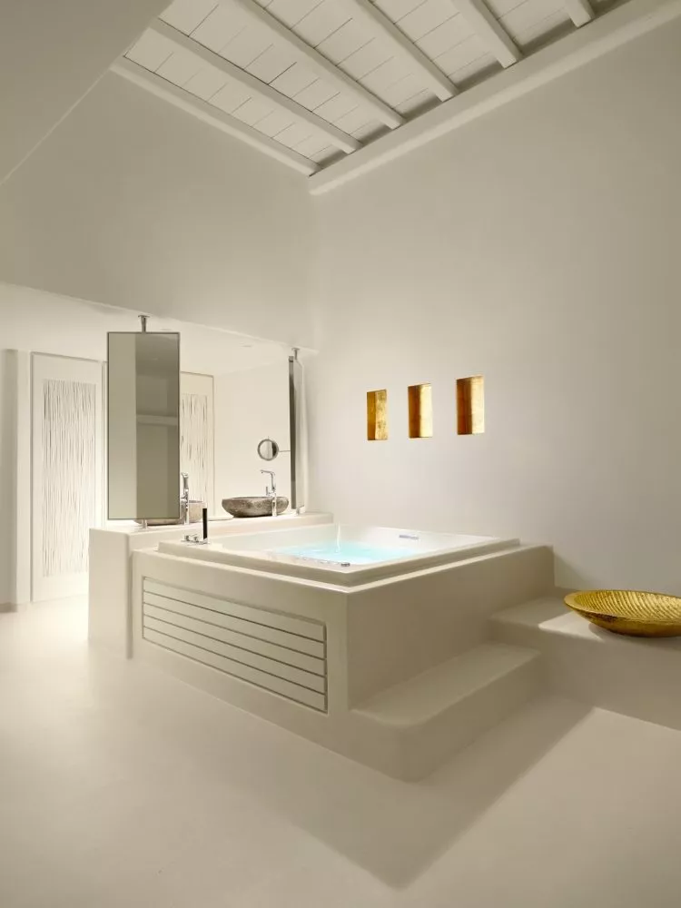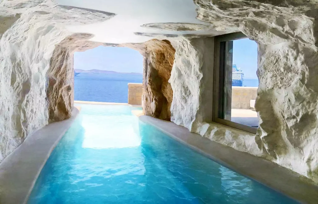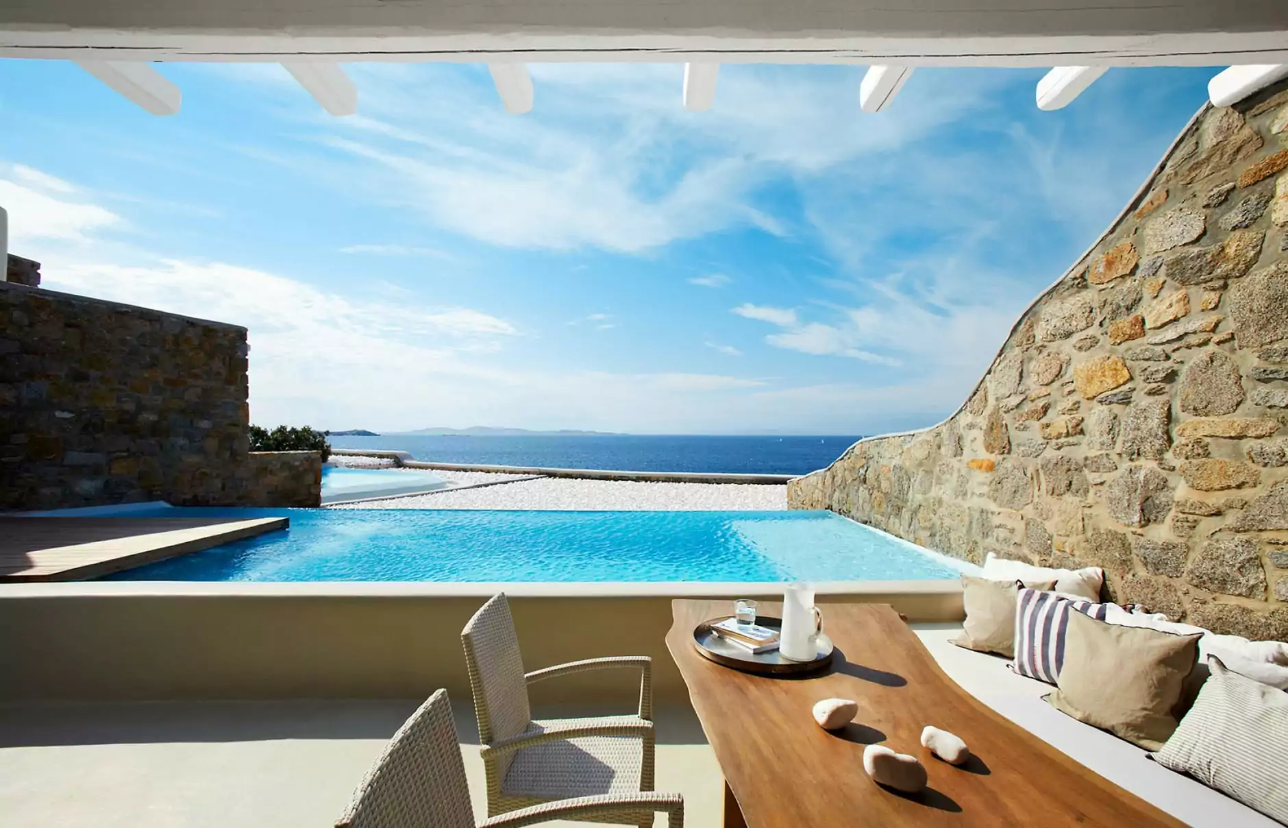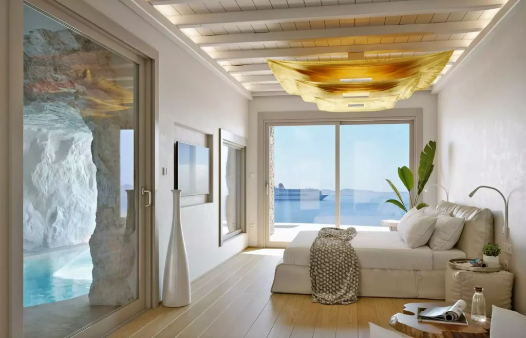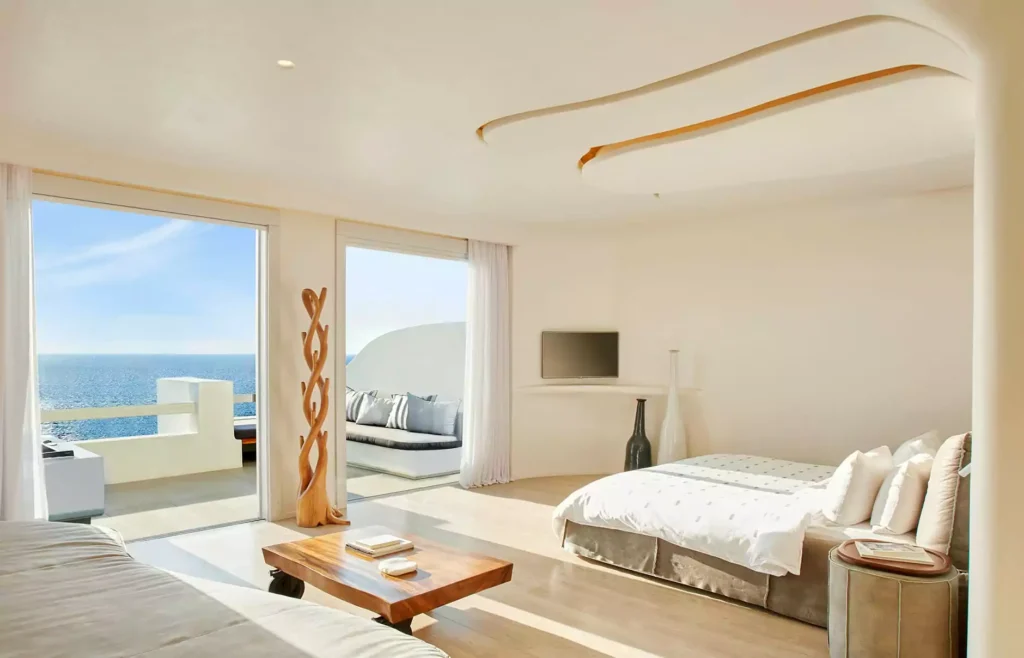 Alle værelser og suiter er individuelt indrettede og designet. Svært at vælge, det ene fra det andet. Værelserne er moderne, med minimalistisk udseende, afbalanceret af Kykladernes traditionelle æstetik. Og imod Mykonos i forvejen skønhed og bløde linjer – med de traditionelle farver (blå, rose, fuchsia) satte arkitekten skinnende marmorgulve, designermøbler og store senge, elegante rummelige badeværelser, store balkoner og private pools i en del af værelserne. Der er over 14 forskellige værelsestyper.